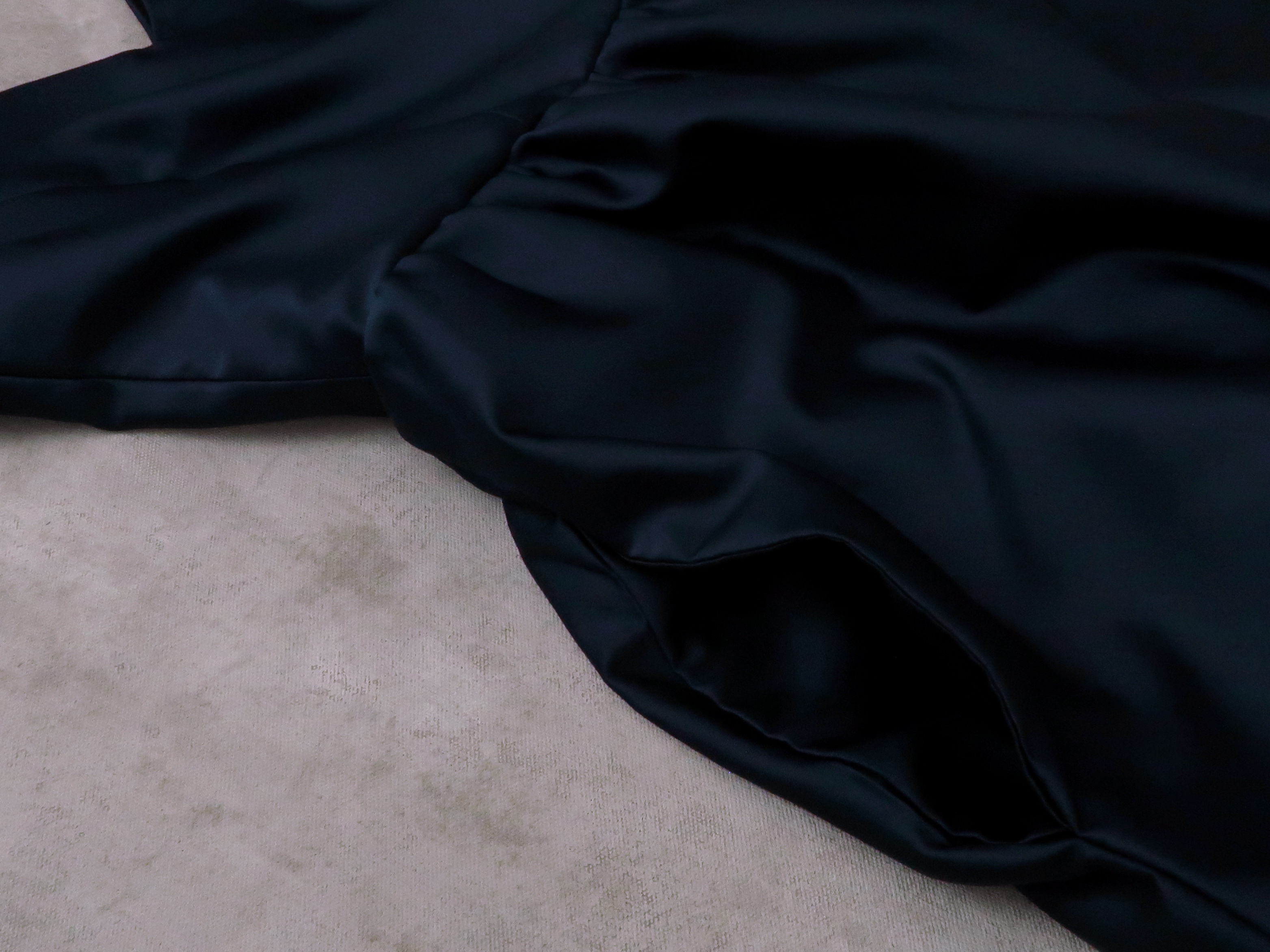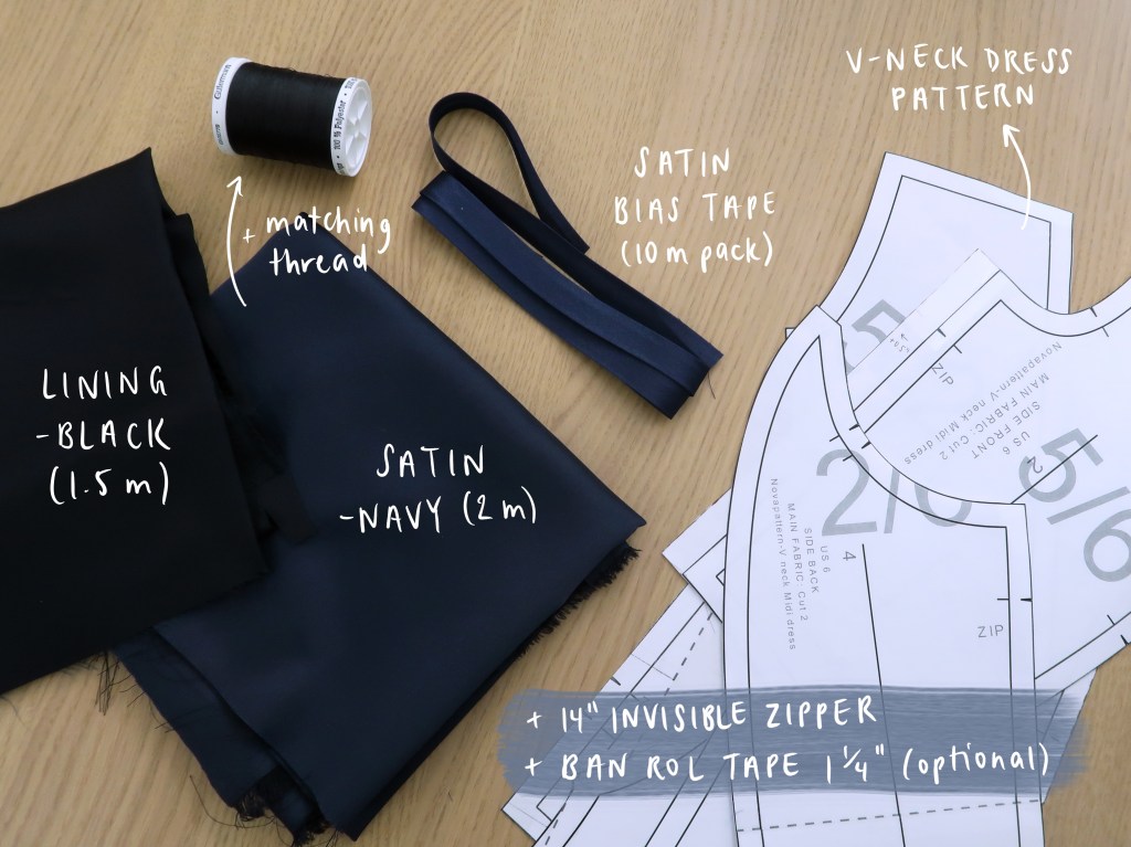 Any big occasion is always a fun opportunity to sew a dress. Back in October, I had a wedding to attend, so I took the chance to sew my own dress for it! Its one of those, “when else will I get the chance to do this?” type things considering I don’t go to many fancy parties. So this was the vision: a v-neck neckline at the front and back with a simple skirt—maybe a slit? maybe with pockets? That’s where I started. Then I perused Etsy to see if there were any patterns that interested me. I’ve been seeing things about AI-generated patterns being sold on Etsy and how they can be pretty terrible in terms of fit, so typically when I’m picking out a pattern on Etsy I make sure to check for reviews and photos from other people who have tried it just to verify the quality of pattern I want to get. The pattern I settled on was designed by the seller NovaPattern, and included a v-neck at the front and back, a gathered skirt, and pockets!! As always, I’d recommend making a sample before cutting out your intended dress fabric; I needed to size up despite what size I would’ve been based on body measurements.